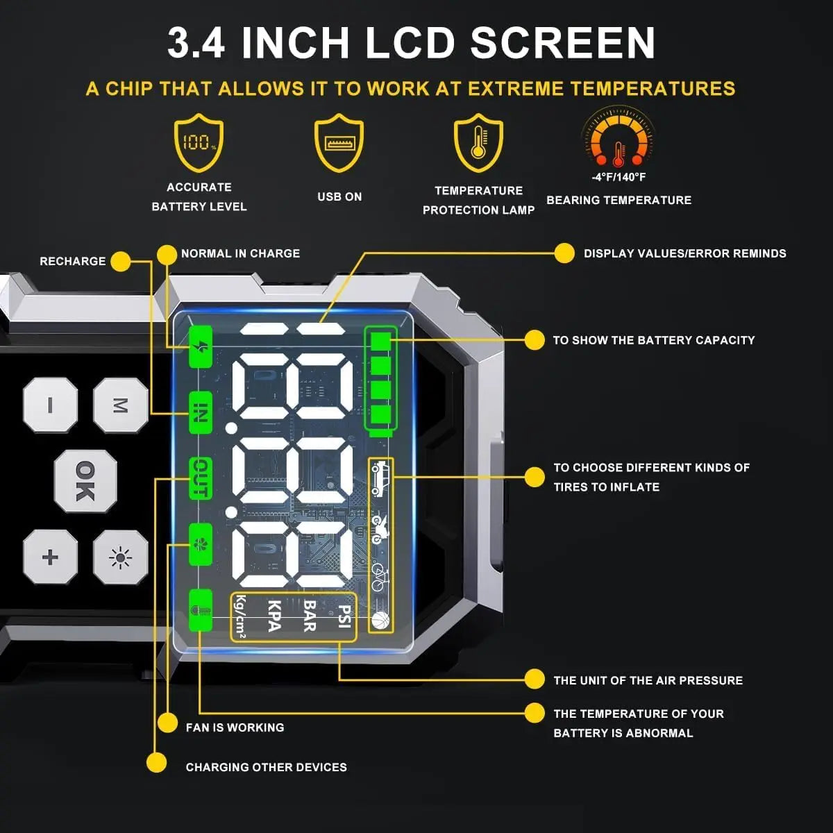 2025 New 4 in 1 Multi-Functional 12V Car Jump Starter 6000A 21800mAh Power Bank With Air Compressor, LED Light, and USB Charger