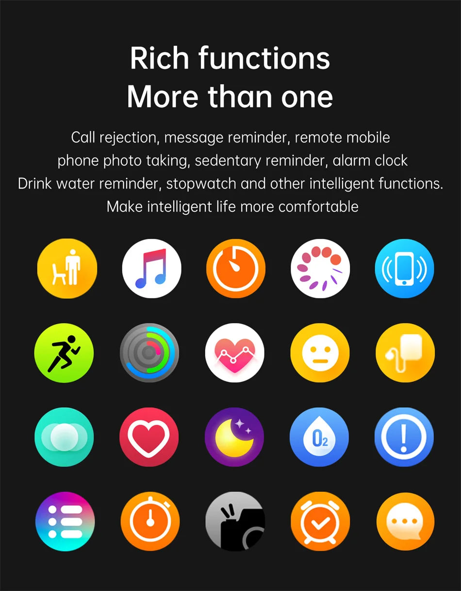 Function: Passometer,fitness tracker,sleep tracker,Mood Tracker,Message Reminder,Call Reminder,Answer Call,Dial Call,REMOTE CONTROL,Push Message,Chronograph,Alarm Clock,GMT Two Places,Heart Rate Tracker,Interactive Music,Calendar,Countdown,Calculators
