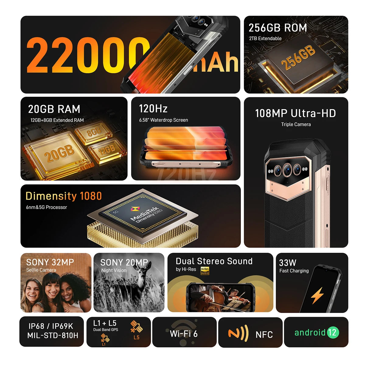 5G Phone DOOGEE V Max Rugged Smartphone 22000mAh,12GB+256GB Cellphone 108MP Camera Smartphone 120Hz Dimensity 1080,Hi-Res,NFC