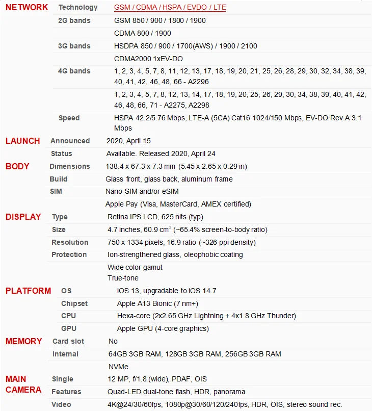 Apple Model: iPhone SE2,Apple A13 Bionic