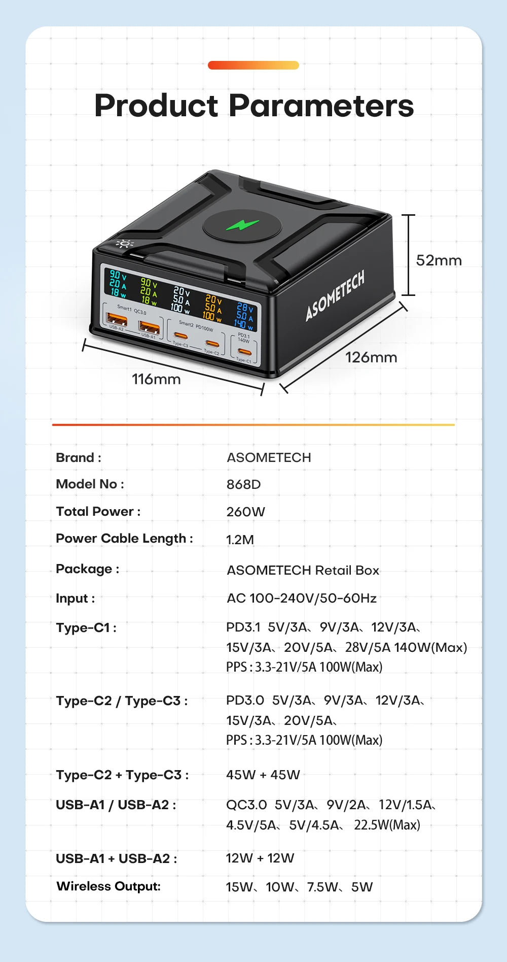 ASOMETECH 260W GaN Charger Digital Display Desktop USB Type C Charger 140W PD3.1 PPS QC4.0 Quick Charger For Laptop Tablet Phone