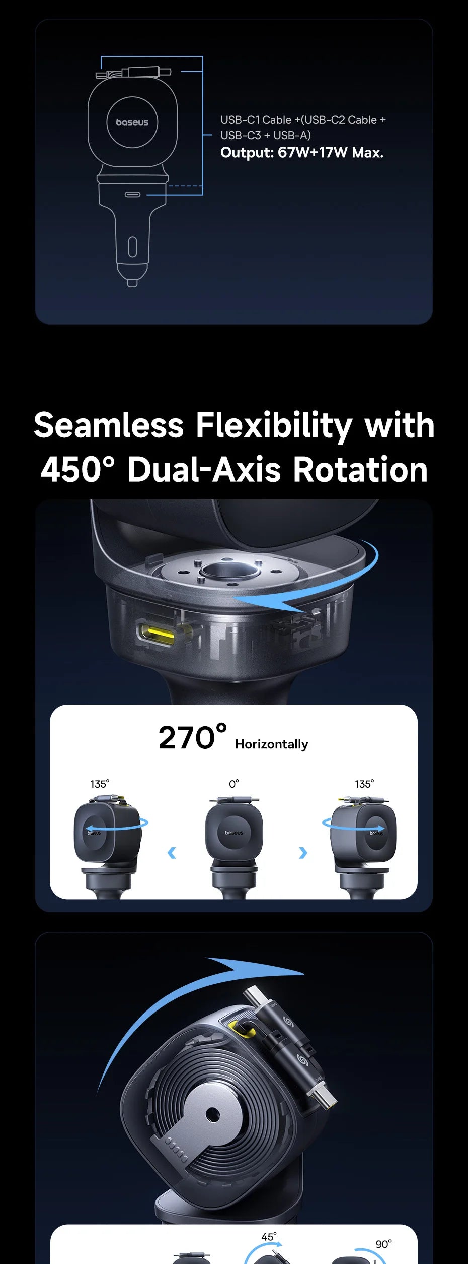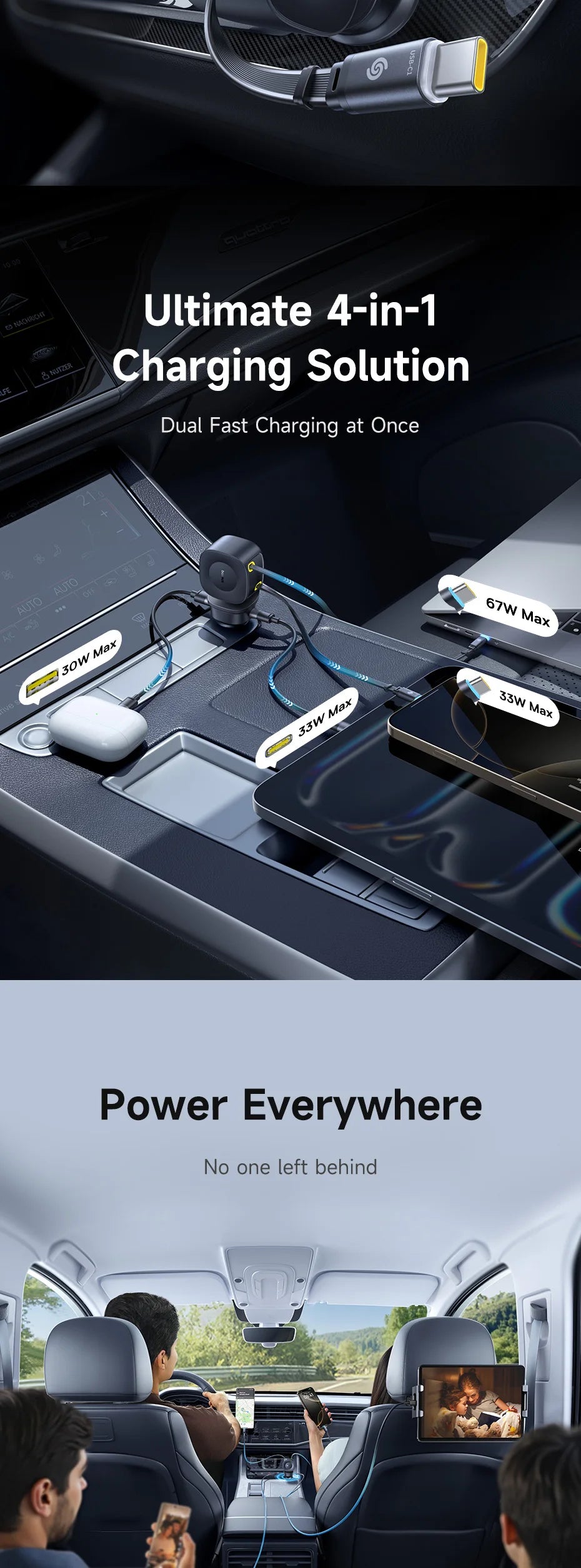 Baseus 100W Car Charger PD QC Fast Charging Dual Type-C Retractable Cable 4 ports 450°Rotation For Laptop Tablet iPhone Samsung