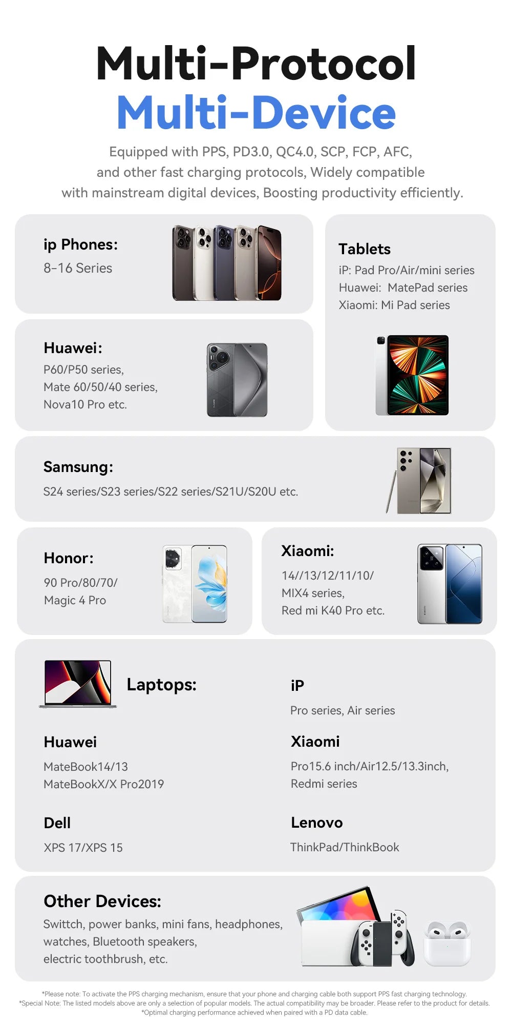 Applied Fast Charge Protocols: Samsung Adaptive Fast Charge,Huawei FCP,USB PD,BC1.2,Qualcomm Quick Charge,Huawei Quick Charge