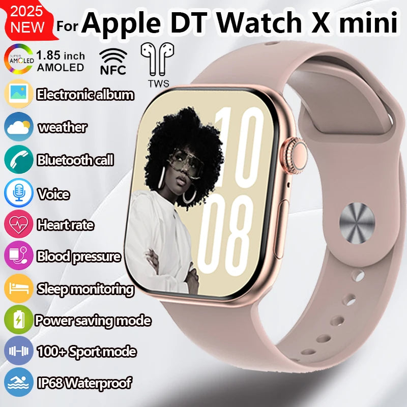 For Apple DT Watch X Mini Smart Watch 3D Menu Video AI Voice NFC Sports Record Health Test 1.85 Inch AMOLED Women Smartwatch