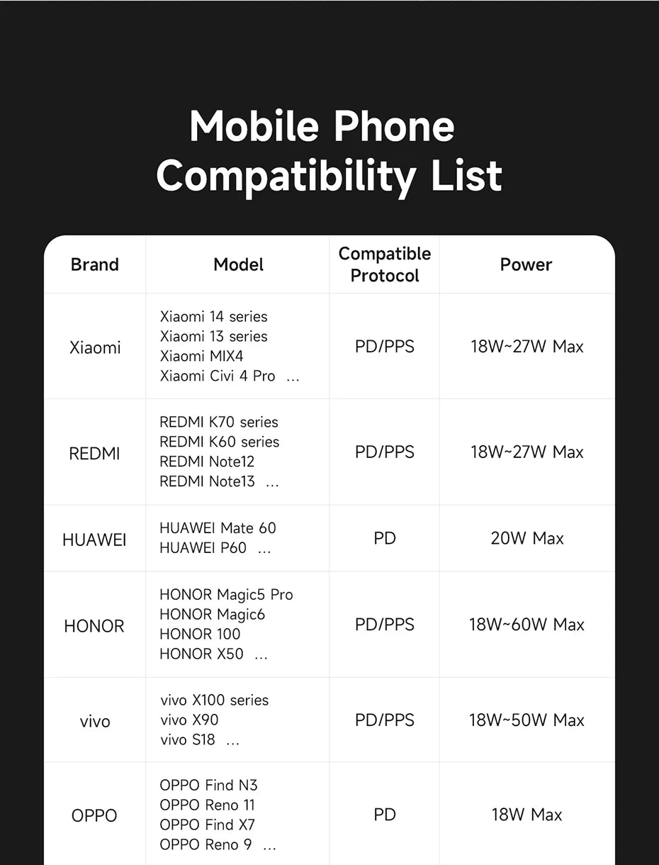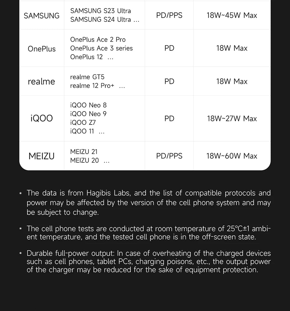Applied Fast Charge Protocols: VIVO Super FlashCharge,Samsung Adaptive Fast Charge,OPPO Vooc,Huawei FCP,USB PD,Other,BC1.2,Qualcomm Quick Charge,Huawei Quick Charge