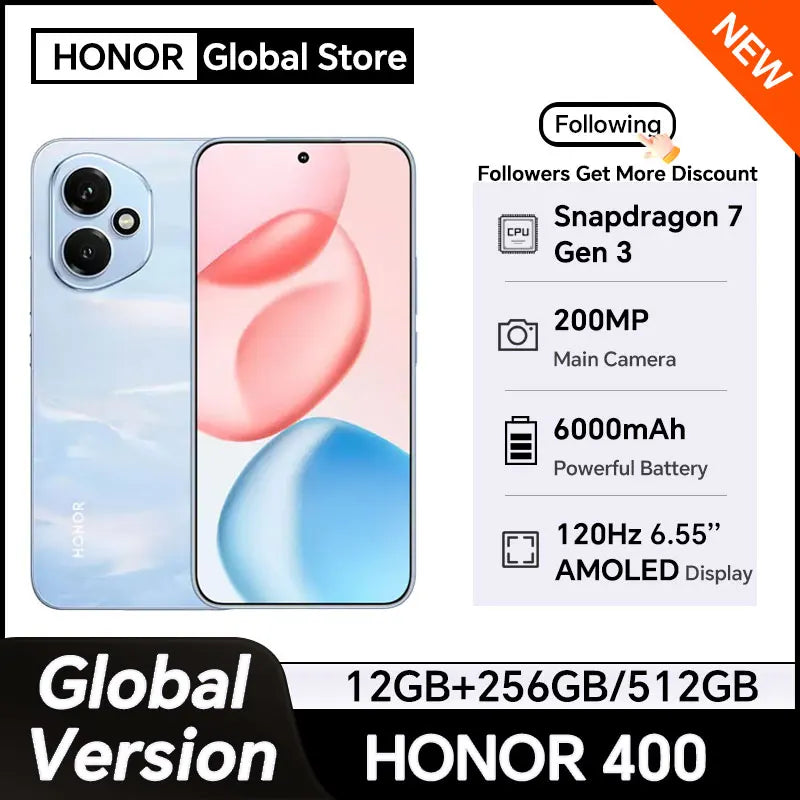 HONOR 400 Global Version 5G Smartphone 6.55'' AMOLED 120Hz Screen Snapdragon 7 Gen 3 6000mAh Battery 80W Supercharge eSIM IP66