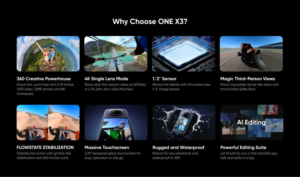 Insta360 X3 - Waterproof 360 Action Camera with 1/2" 48MP Sensors, 5.7K 360 Active HDR Video, 72MP 360 Photo, 4K Single-Lens