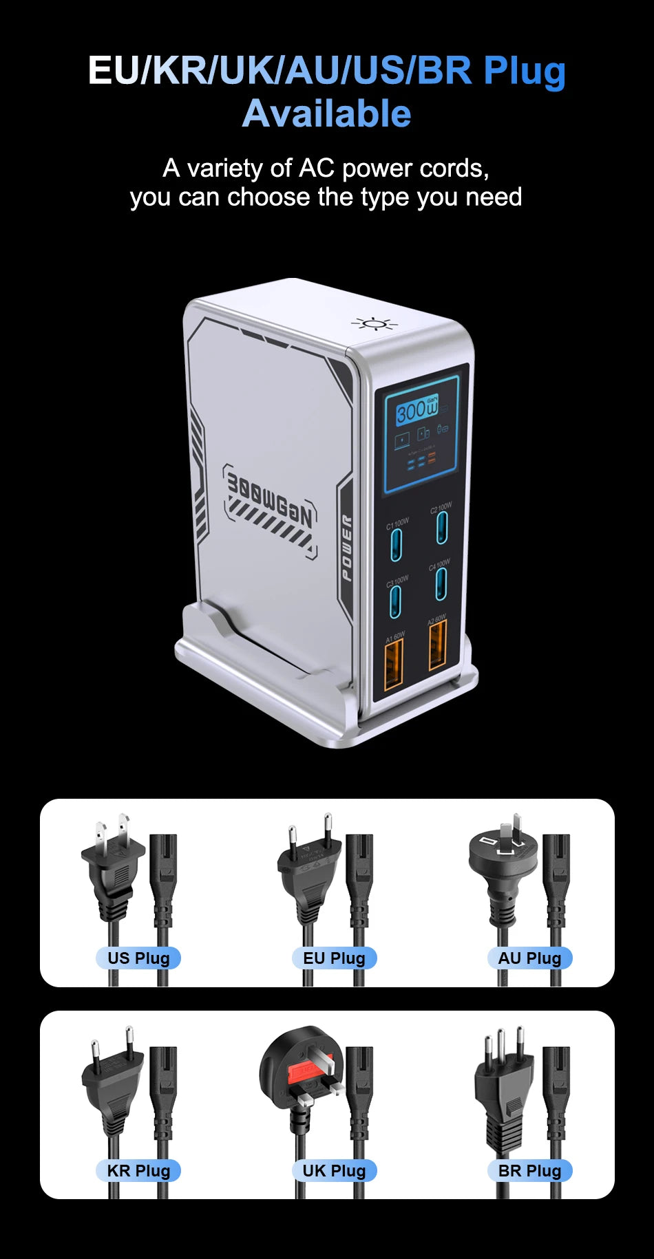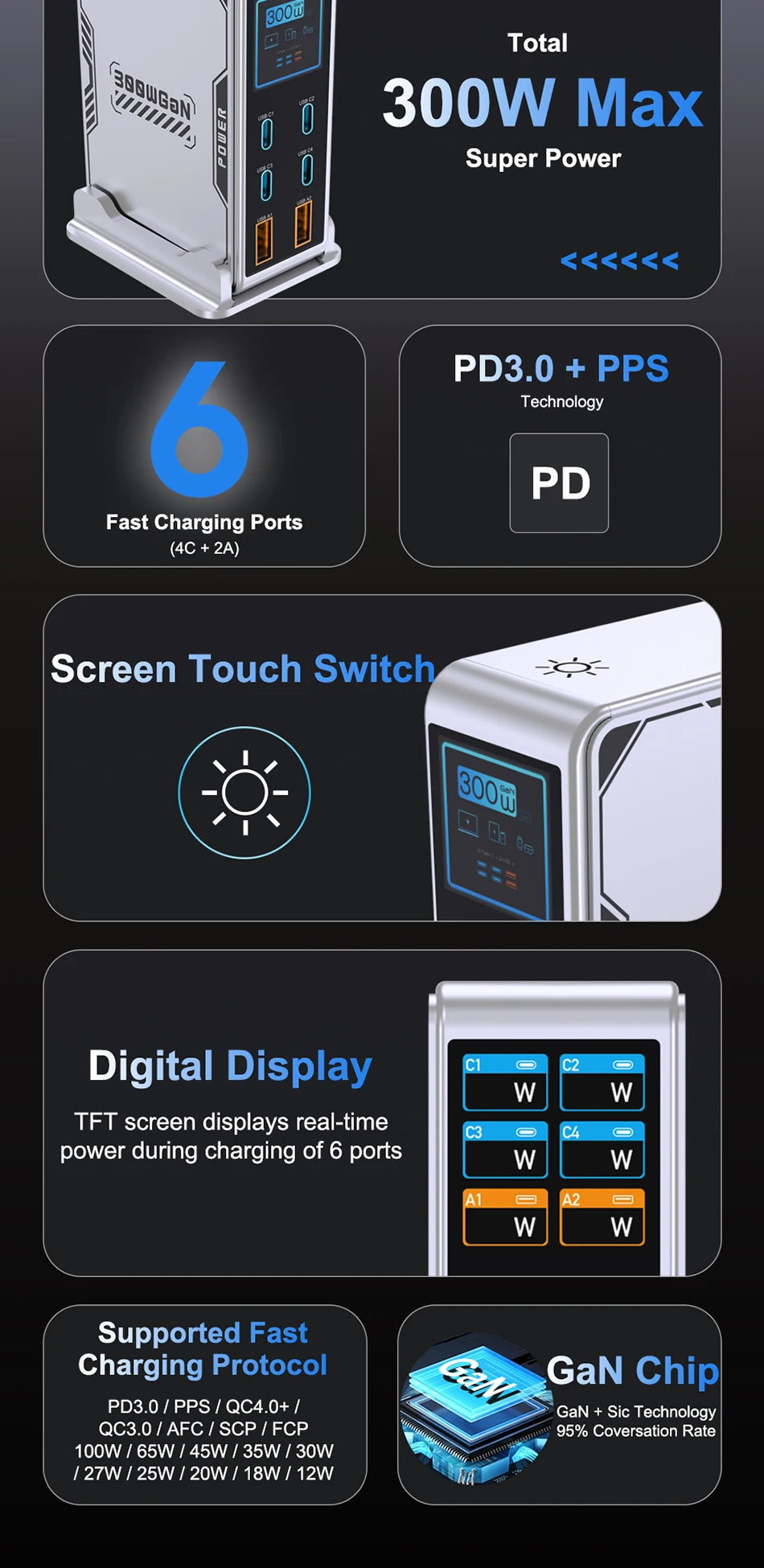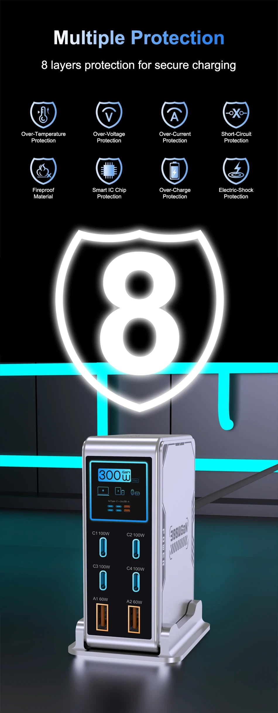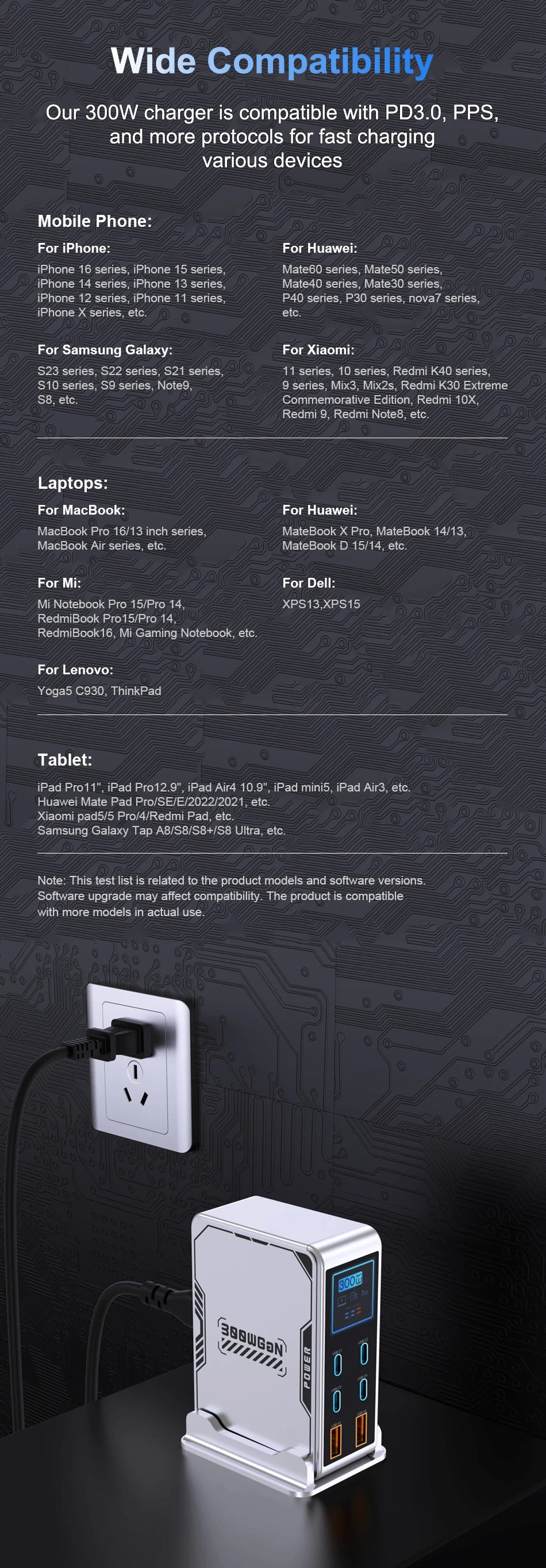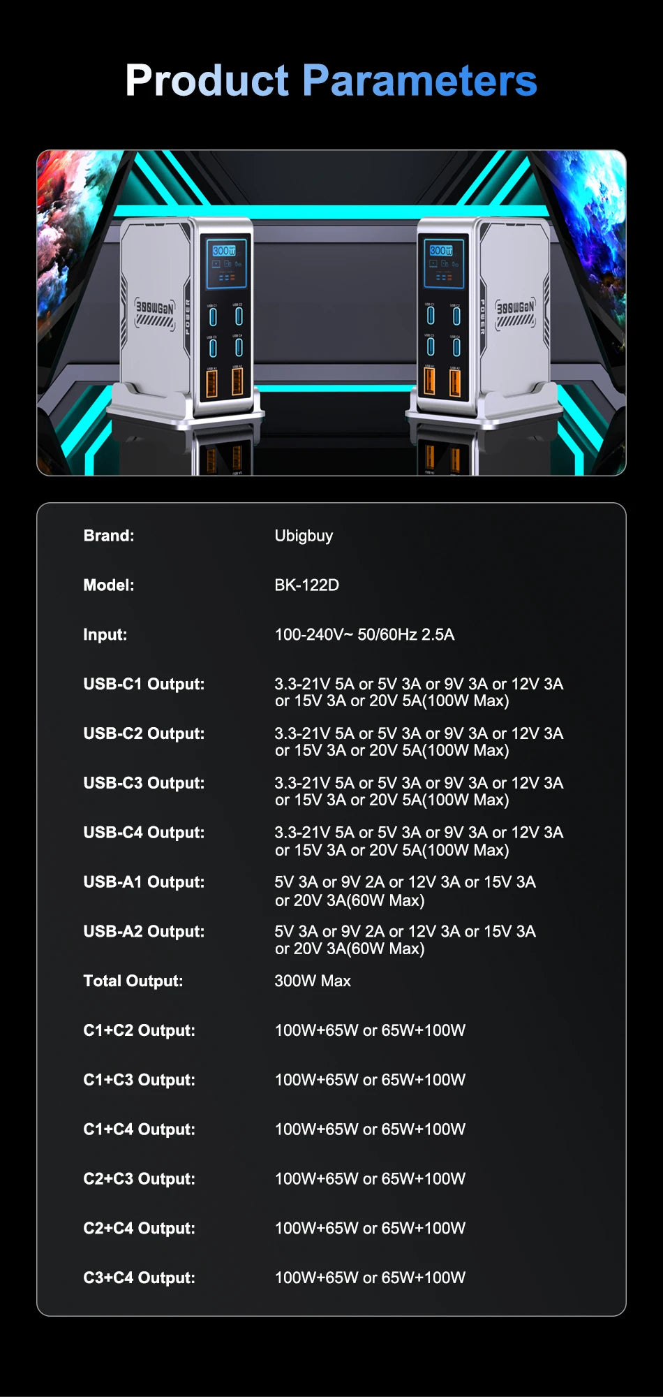 Ubigbuy 300W GaN Charger PPS PD 100W USB Type C 6-Port Digital Display Desktop Fast Charging Station for MacBook iPhone Samsung