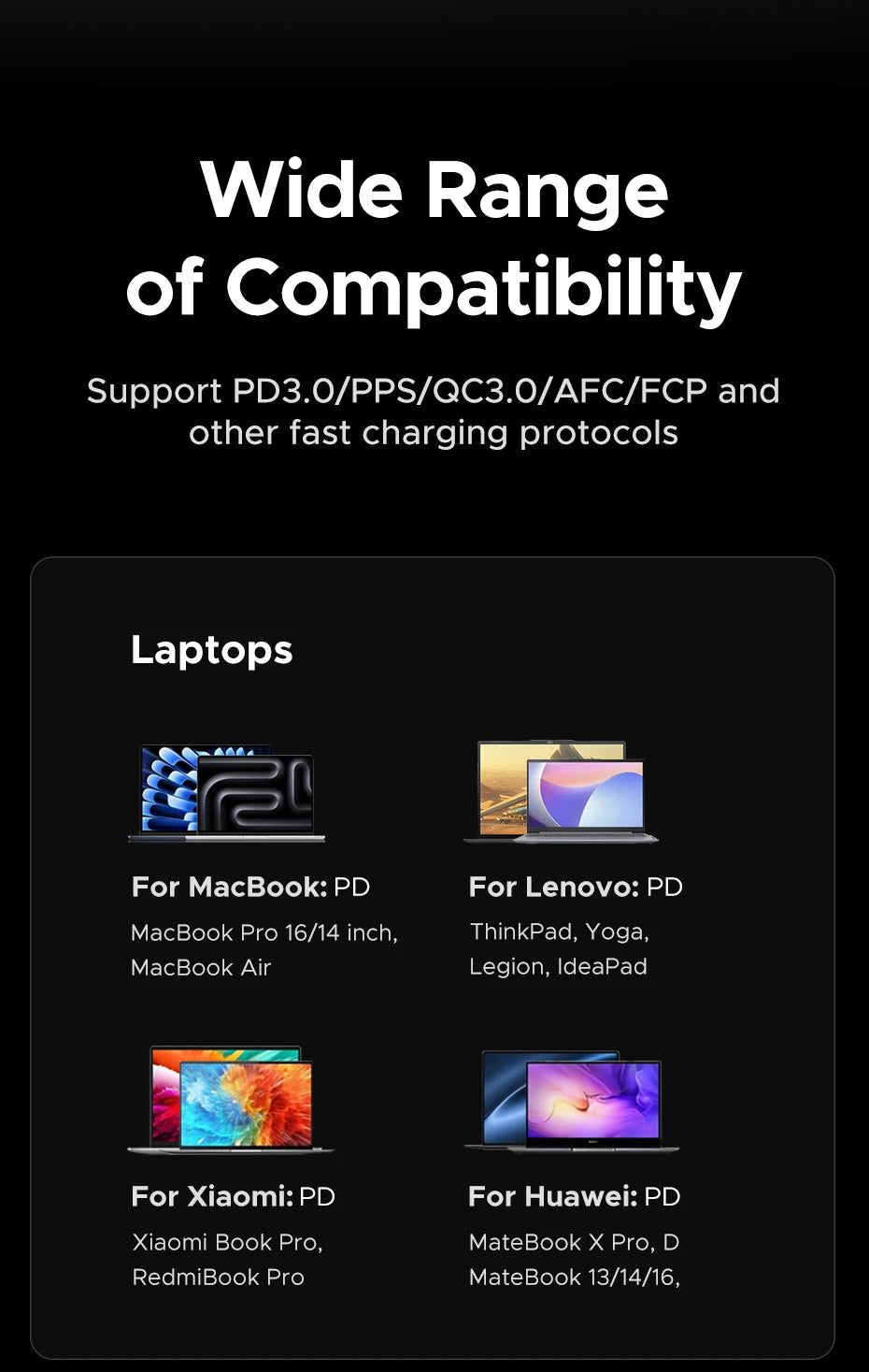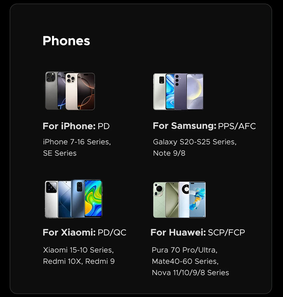 Applied Fast Charge Protocols: Samsung Adaptive Fast Charge,Huawei FCP,USB PD,BC1.2,Qualcomm Quick Charge,Huawei Quick Charge