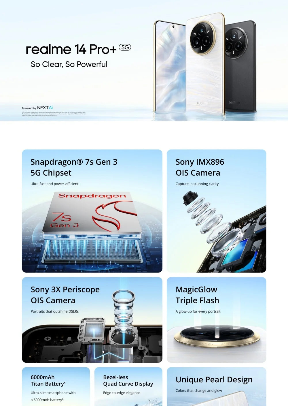 Unlocked realme 14 Pro Plus 5G NFC Snapdragon 7s Gen 3 50MP 3X Periscope OIS Camera 6.83" Curved Screen 6000mAh Battery IP69