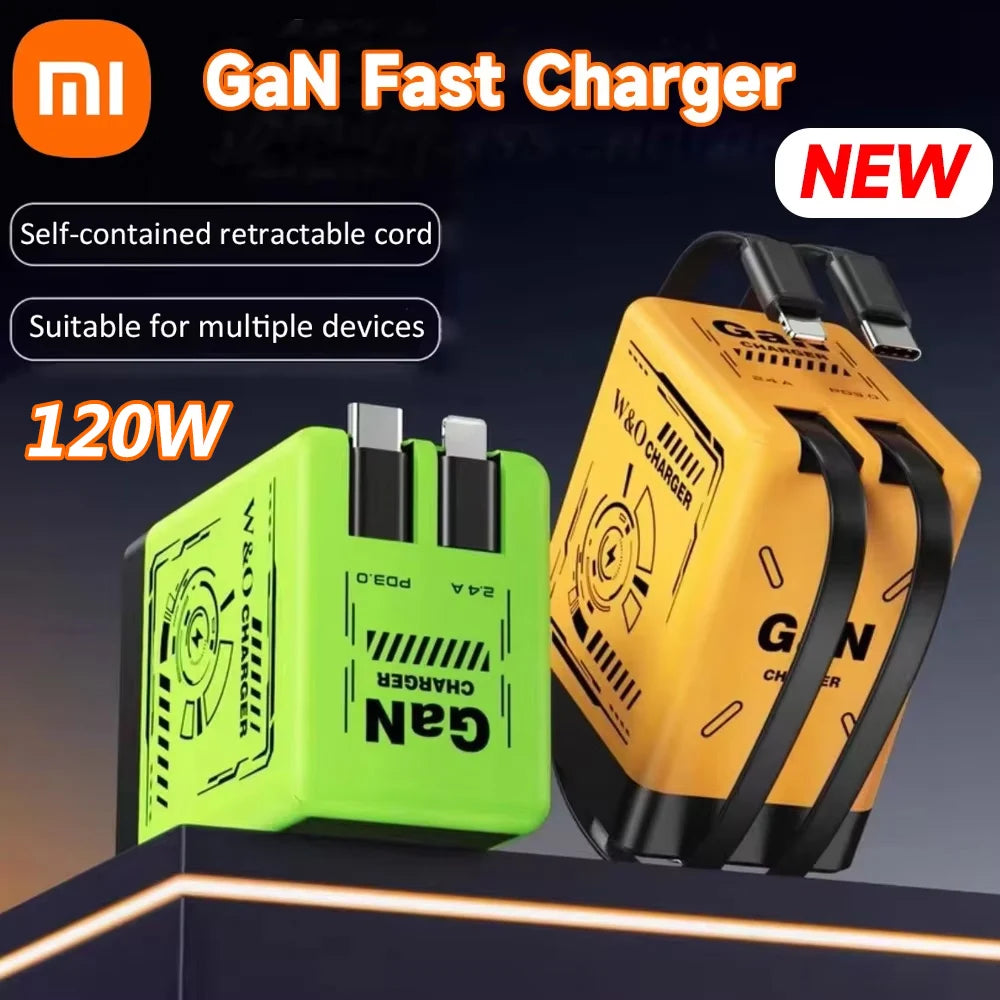 XIAOMI GaN 120W Fast Charger with Retractable Type-C Ligting Cable Portable Multi-Device Folding Adapter For iPhone Samsung